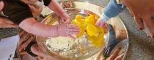 Kirkerummet danner ramme om sang, leg, dans (og lidt plask). Vi synger enkle salmer med fagter, leger sanglege og vugger i dyner. Vi bruger sæbebobler, faldskærm og rasleæg.